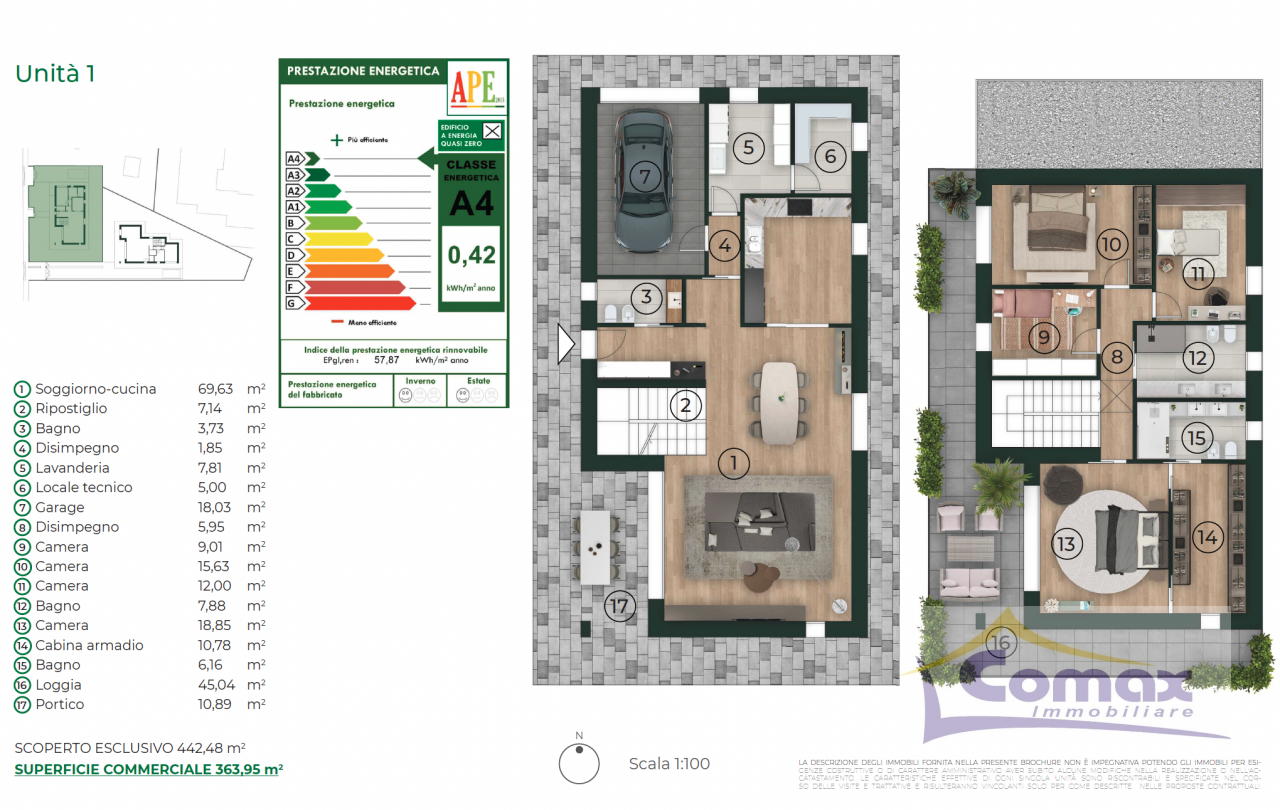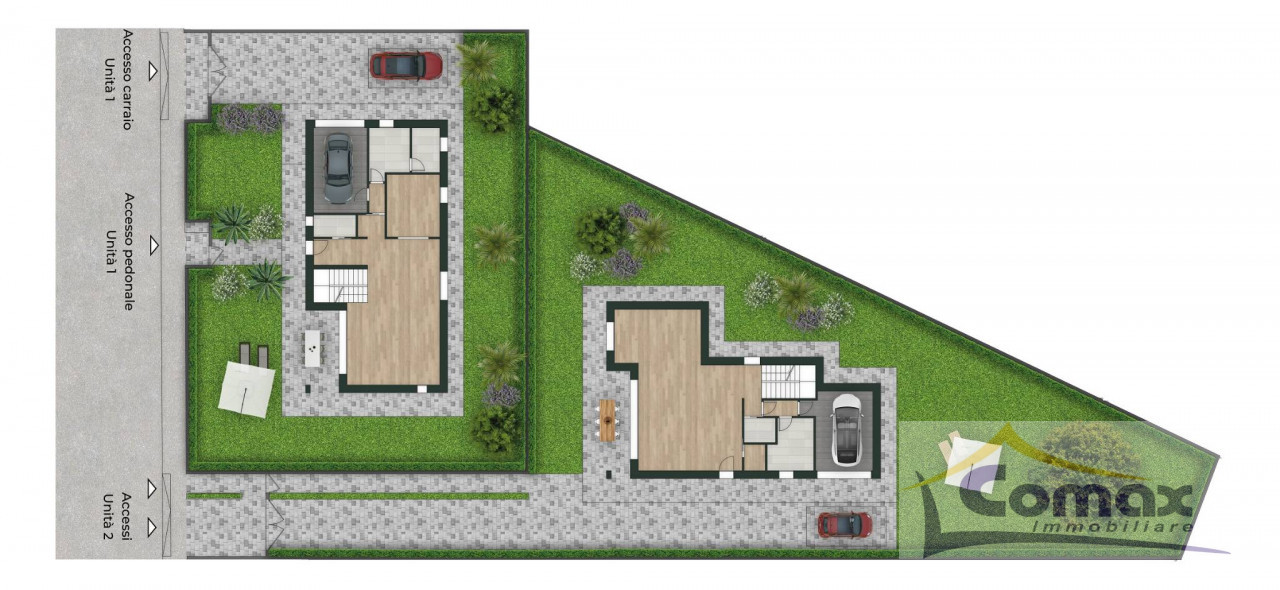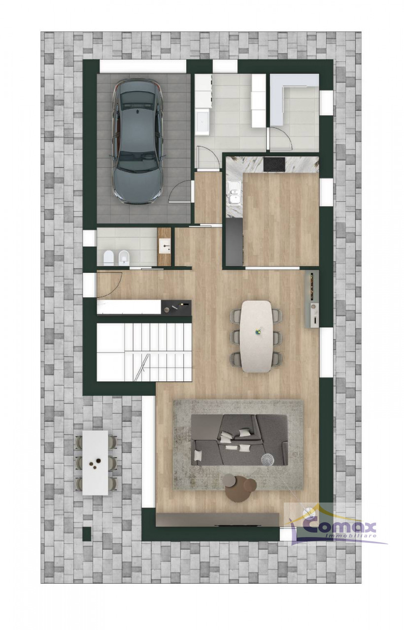 Distribuita su due livelli, la villa è progettata con attenzione ai dettagli e al comfort. Al piano terra si trova una luminosa zona living di ben 69 mq, ideale per accogliere amici e familiari. La cucina separabile offre accesso diretto al portico esterno, rendendo facile vivere all'aperto durante le belle giornate. Completano il piano un bagno finestrato pratico ed elegante, un ripostiglio utile per lo stoccaggio e l'accesso alla centrale termica oltre a un garage spazioso.