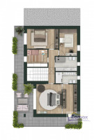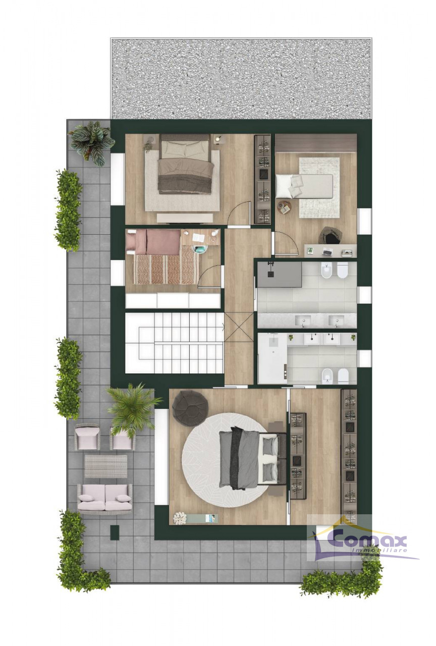 Al primo piano troviamo quattro camere da letto confortevoli; la camera principale dispone anche di una cabina armadio privata per soddisfare tutte le esigenze organizzative. Due bagni finestrati offrono comodità aggiuntiva alle famiglie numerose o agli ospiti. Un ampio terrazzo invita a momenti di relax con vista sul verde circostante.