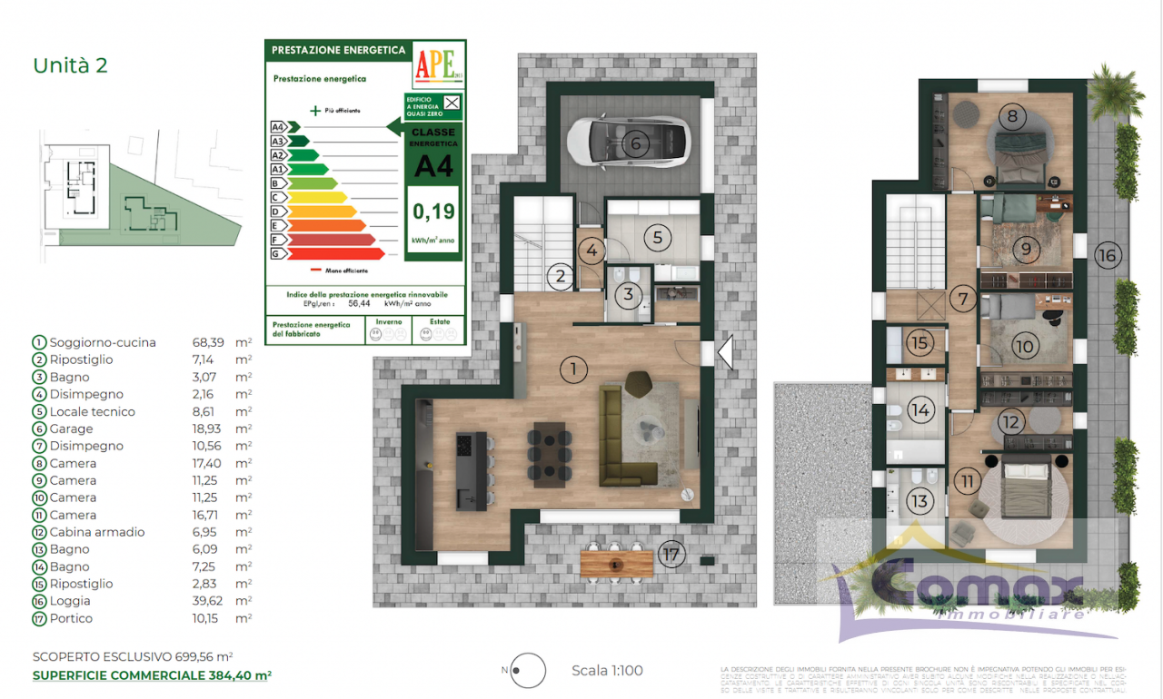 Distribuita su due livelli, la villa è progettata con attenzione ai dettagli e al comfort. Al piano terra si trova una luminosa zona living di ben 68 mq, ideale per accogliere amici e familiari. La cucina separabile offre accesso diretto al portico esterno, rendendo facile vivere all'aperto durante le belle giornate. Completano il piano un bagno finestrato pratico ed elegante, un ripostiglio utile per lo stoccaggio e l'accesso alla centrale termica oltre a un garage spazioso.