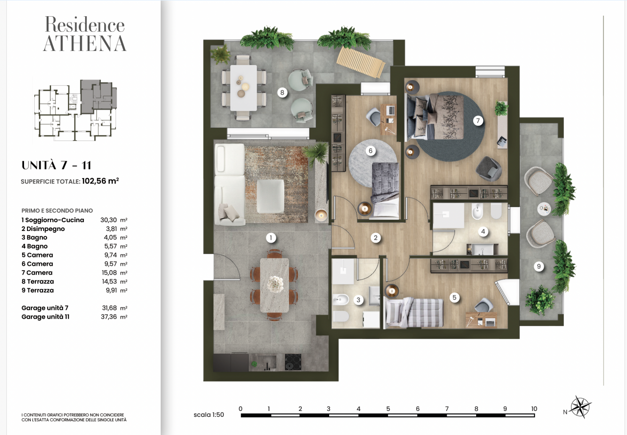 Questo appartamento è situato al piano secondo, ingresso sulla zona living con angolo cottura, loggia di circa 17mq. Il disimpegno porta alla zona notte dove troviamo due camere da letto singole e la matrimoniale, seconda loggia di circa 10mq. Due sono i bagni uno dei quali finestrato.